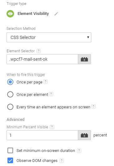 למרבה המזל גוגל הוסיפה לתג מנג'ר טריגר מסוג Element Visibility, והוא בהחלט הופך את החיים לקלים יותר. ניתן לעקוב בקלות רבה יותר לא רק אחרי שליחת טפסים, אלא אף למדוד פעולות "זניחות" אחרות, שלא תמיד מחייבות ביצוע פעולה של ממש מצד המשתמש (כגון קליק).
