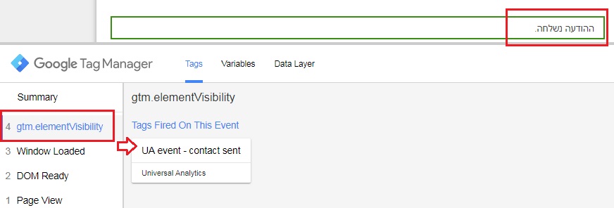 בשלב זה מומלץ מאוד לבצע בדיקה מקדימה בתג מנג'ר (Preview), כדי לוודא שהתג אכן נורה והמעקב תקין. כפי שניתן לראות, התג שנורה ב- element visibility הוא אותו תג שהקמנו.