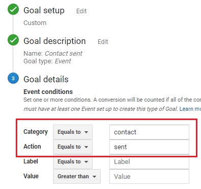 2. ליצור יעד חדש באנליטיקס מסוג Custom Goal >> Event, דבר שיצריך מכם להקים אותו בהתאם לתג שפתחתם בתג מנג'ר (בדיוק אותם שמות לקטגוריה ולפעולה בשני המקומות):