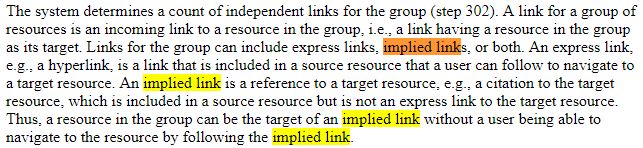 במסמך הפטנט, שנקרא Ranking Search Results, מצוין במפורש שיש דבר הנקרא "קישור ישיר" (Express Link שמוביל את המשתמש למקום אחר בקלקה), ויש "קישור מרומז" (Implied Link שהוא רק אזכור של קישור, כלומר כזה שאינו לחיץ: www.websem.co.il למשל).