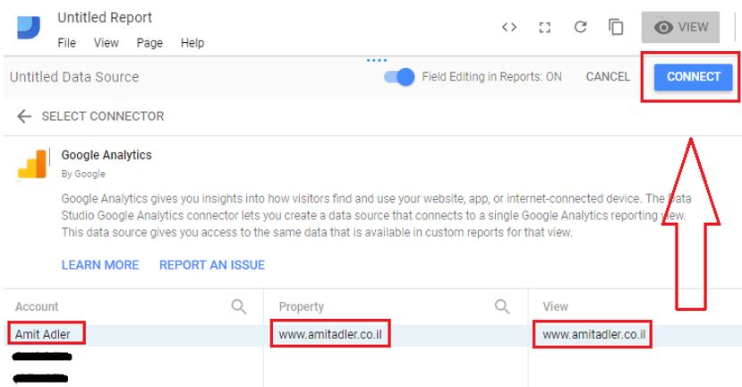 מכיוון שכאן מדובר באנליטיקס יש לבחור הן את החשבון (Account), הן את הנכס (Property) והן את המבט (View). לאחר שהקלקנו על ה- View הרלוונטי, יופיע כפתור כחול בצד ימין למעלה ויבקש מאיתנו לבצע את החיבור:
