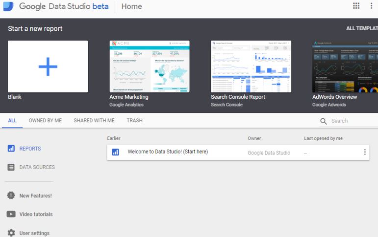 ניגשים לאתר datastudio.google.com ומתחברים עם חשבון גוגל הרלוונטי (אותו חשבון בו נמצאים הנתונים – אנליטיקס, אדוורדס, קונסולת החיפוש וכו'). בחלק העליון יש אפשרות להתחיל עם דוח בסיסי שאותו נקים מאפס (הריבוע הלבן משמאל) או להשתמש בתבניות קיימות.