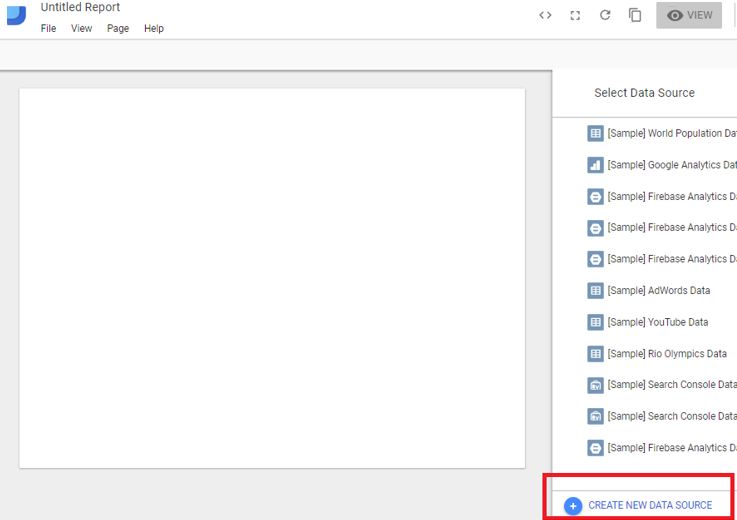 לצורך הדוגמה נבחר בדוח הריק. לאחר מכן נצטרך לבחור את מקור המידע ממנו נרצה לשאוב נתונים (אנליטיקס, אדוורדס וכו'). לשם כך נקליק על Create New Data Source מצד ימין בתחתית הדוח: