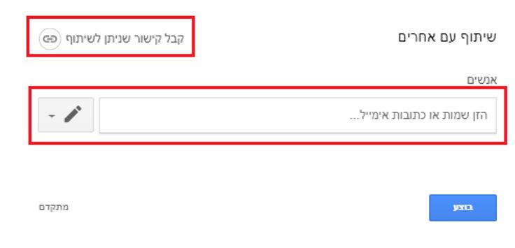 בחלונית שתיפתח נוכל להגדיר מי יקבל הרשאת צפייה או עריכה. ניתן לעשות זאת לפי כתובות מייל ספציפיות (במרכז התמונה), או לחילופין לקבל קישור שניתן לשיתוף (בראש התמונה): רק אנשים ספציפיים, רק מי שיש לו את הקישור, או ציבורי לחלוטין באופן שיהיה חשוף גם למנועי חיפוש (אני ממליץ להימנע מזה, לצורך שמירה על סודיות).