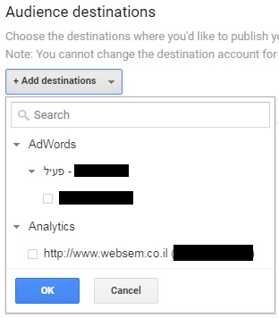 לאחר אישור נבחר כמה זמן נרצה שהקהל יישב ברשימת הרימרקטינג (Membership Duration). כמו כן אנו רואים לאילו אפיקים מתאים הקהל שבחרנו (Eligibility) – באנרים (דיספליי), רימרקטינג בחיפוש, אנליטיקס וכן הלאה.