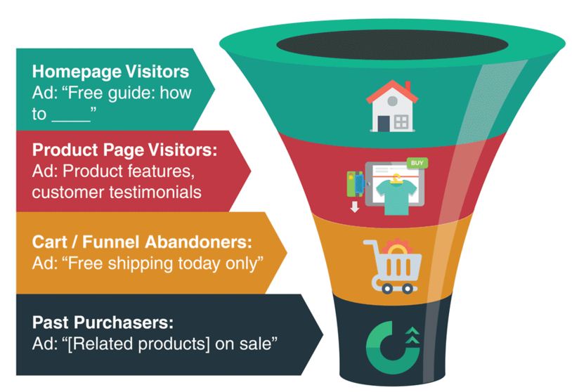 משתמשים שהיו רק בעמוד הבית יקבלו מסר קליל לצורך תזכורת; משתמשים שצפו במוצר ספציפי יקבלו מסר יותר חד וברור (או רימרקטינג דינמי – ראו בהמשך); משתמשים שכבר היו רגע לפני רכישה אבל נטשו, יקבלו הנחה שתעודד אותם לרכוש; וכן הלאה.