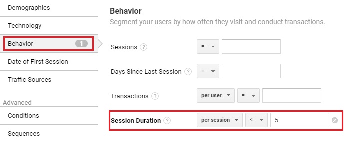 כדי לעשות זאת ניגש שוב לקהלים באנליטיקס, ניצור קהל חדש ונבחר את זמן השהייה הרלוונטי (בשניות). במקרה הזה, נרצה ליצור קהל נפרד מכל מי ששהה באתר פחות מ-5 שניות: