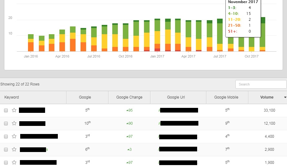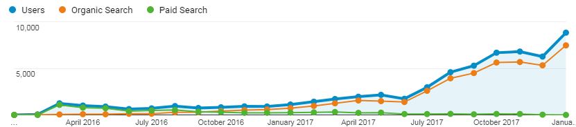 החל משנת 2017 החלה עלייה משמעותית יותר בכניסות לאתר, ובחודש יולי התרחשה הקפיצה הדרסטית ביותר בכניסות – הן בכניסות הכלליות לאתר והן בכניסות האורגניות. בשלב זה של העבודה, הטראפיק הממומן כבר הצטמצם משמעותית – מלמעלה מאלף כניסות בחודש בתחילת העבודה, לכדי 100 כניסות בחודש בקיץ 2017; כל זאת כאשר הטראפיק האורגני ממשיך לצמוח במאות אחוזים. הישג מכובד בהחלט לאתר של לא יותר מ-100 עמודים.