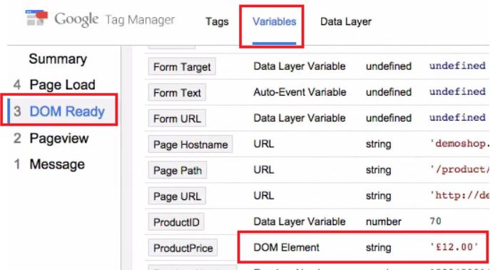 ברגע שתיפתח חלונית התצוגה בתחתית, ניגש ל"משתנים" בחלק העליון (כי יצרנו משתנה חדש מסוג דום אלמנט) ובתפריט הצדדי נבחר את האיוונט DOM Ready המעיד שגוף המסמך נטען במלואו.