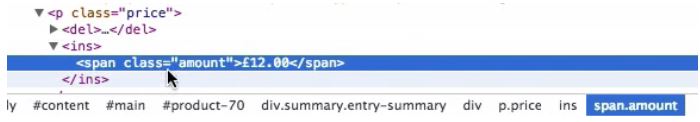 לשם כך נחוצה היכרות ראשונית עם חוקי ה- CSS – בשורת המחיר, המודגשת בכחול, ניתן לראות שיש class שנקרא amount עטוף ב- span סביבו.
