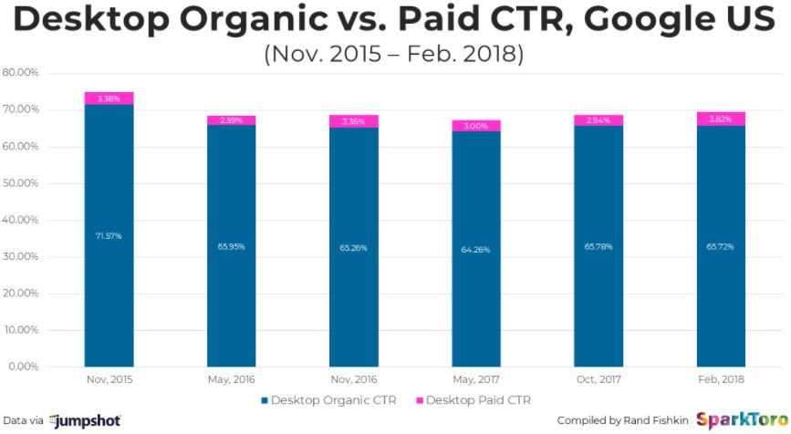 כפי שניתן לראות מהגרף, בין נובמבר 2015 לפברואר 2018 חלה ירידה משמעותית בקליקים אורגניים (71% לעומת 65%) לעומת עלייה זניחה בקליקים ממומנים (3.38% לעומת 3.82%).