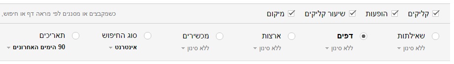 בלוח הבקרה של ניתוח החיפושים, סמנו את כל 4 האפשרויות העליונות (קליקים, הופעות, שיעור קליקים ומיקום), ולאחר מכן הקליקו על "דפים" (במקום "שאילתות") ובחרו את טווח התאריכים הרצוי לכם (עד 90 יום).