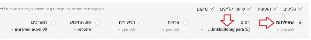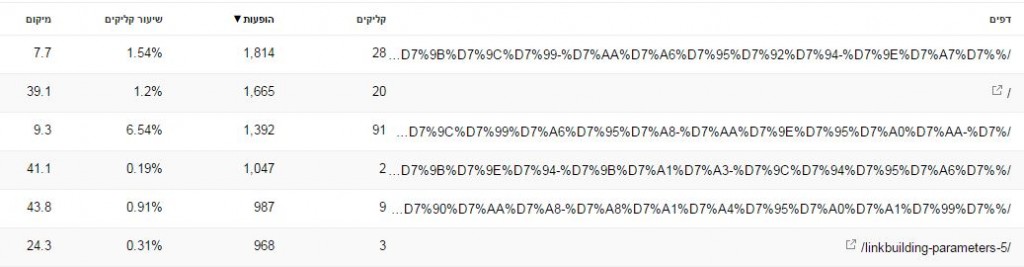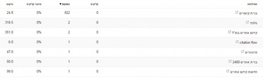 כעת אנו רואים אילו ביטויים הגולשים חיפשו כאשר הדף הופיע בתוצאות ובאילו ביטויים הם הקליקו. מכאן קלה הדרך להבין שלמרות שהדף עוסק בבניית קישורים, הוא כנראה לא ענה על הצורך של הגולשים במקרים הספציפיים הללו.