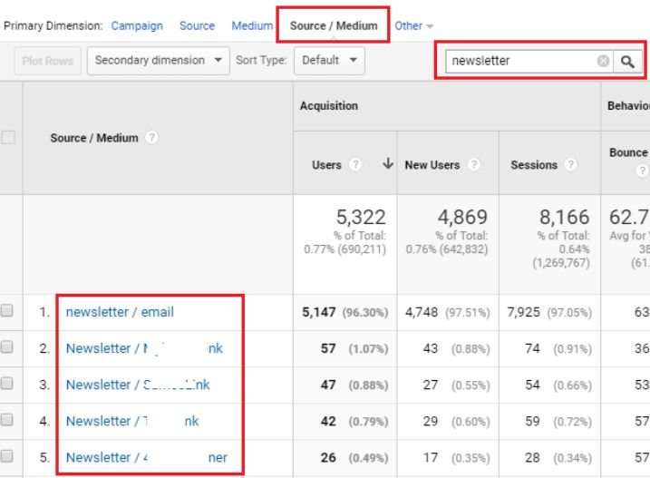 לא משנה באיזה דוח נבחר, הנקודה היא שצריך למצוא את שמות הפרמטרים שבחרנו. בדוגמה הקודמת יש לנו 3 קישורים עם source שאותו כינינו newsletter – לפיכך צריך להקפיד שהדוח מציג את source (בחלק העליון) ולאחר מכן ניתן למצוא את newsletter בתיבת החיפוש: